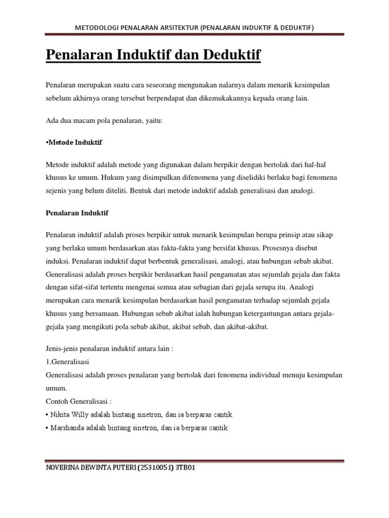 Dibagi menjadi dua jenis yakni penalaran deduktif dan penalaran induktif. Makalah filsapat ilmu penalaran, logika, deduktif, induktif dan metode ilmiah. Induktif yang berujung pada empirisme. Salah satu ciri utama dalam mempelajari matematika adalah menerapkan penalaran deduktif yaitu kebenaran suatu konsep atau pernyataan diperoleh sebagai akibat . 10 penarikan kesimpulan dalam berpikir ilmiah dapat dilakukan dengan dua cara yaitu dengan logika deduktif dan logika induktif.
